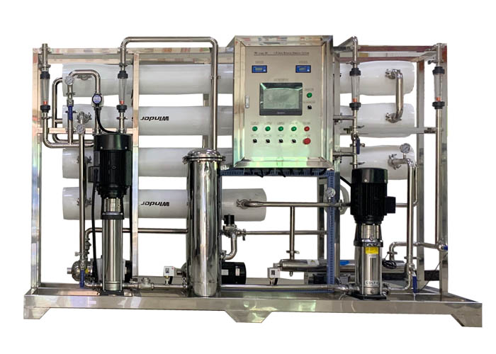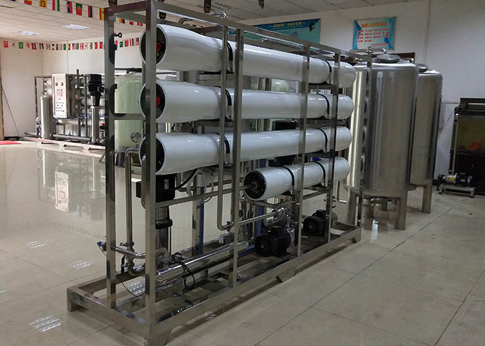 Process: Untreated water feed pump →Quartz sand filter→ Active carbon filter → Security filter → 1st stage high pressure pump →1st stage RO system→2nd stage high pressure pump→2nd stage RO system→UV sterilizer→output supply point