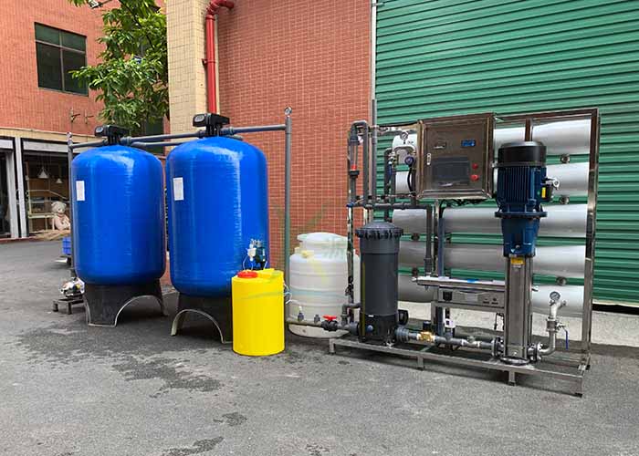 ►Industrial reverse osmosis plant includes a multimedia prefilter, water softener or antiscalant dosing system(optional), dechlorination dosing system, reverse osmosis unit with semi-permeable membranes, and UV sterilizer or post chlorination as a post treatment. |