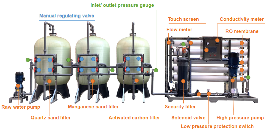 Process: Raw water----raw water tank----raw water pump---quartz sand filter---activated carbon filter---water softener (optional)---security filter----high pressure pump---RO system---UV system (Ozone generator)---pure water tank